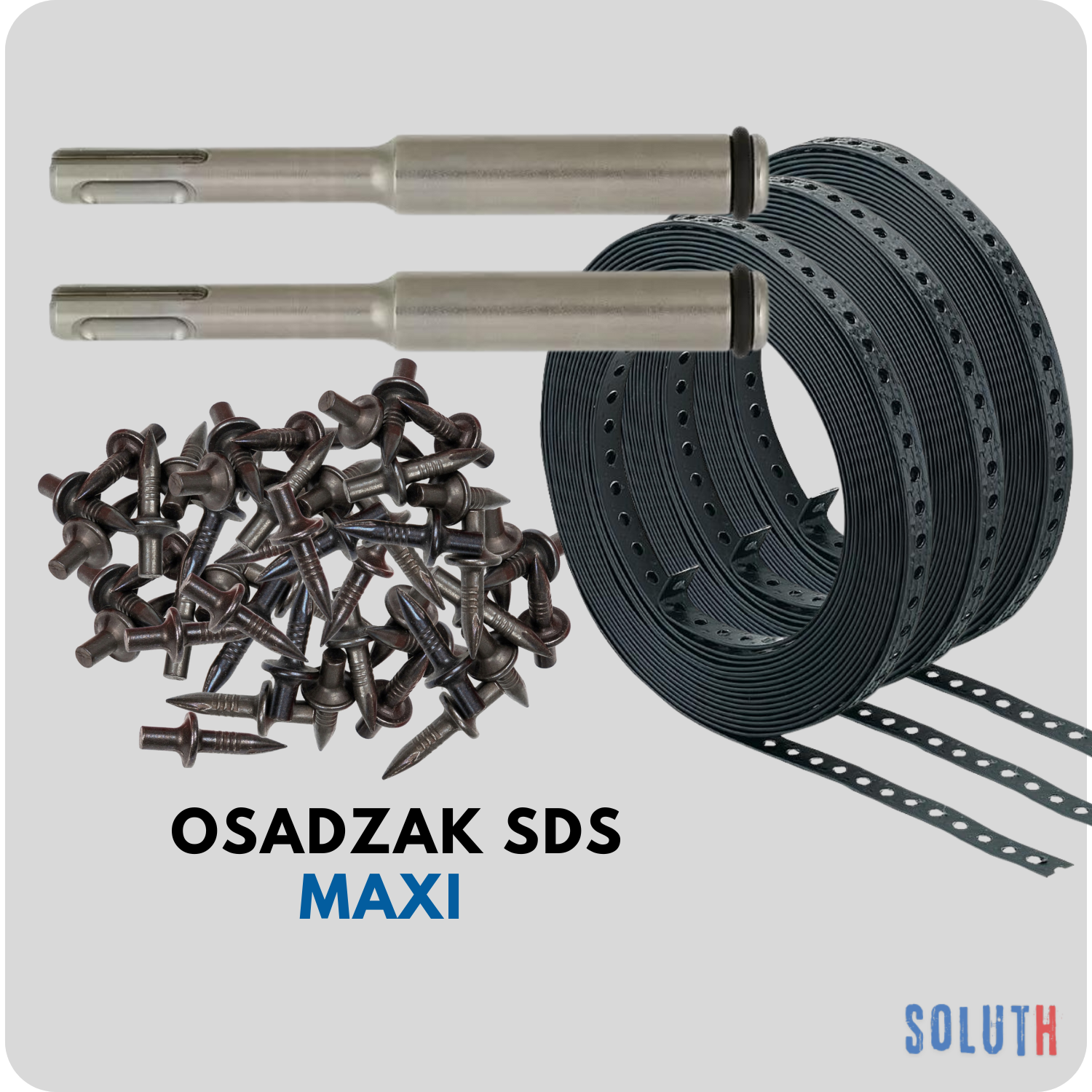 ➡️ Dwa osadzaki SDS, trzy taśmy perforowane powlekane i aż 600 sztuk gwoździ do osadzania w betonie