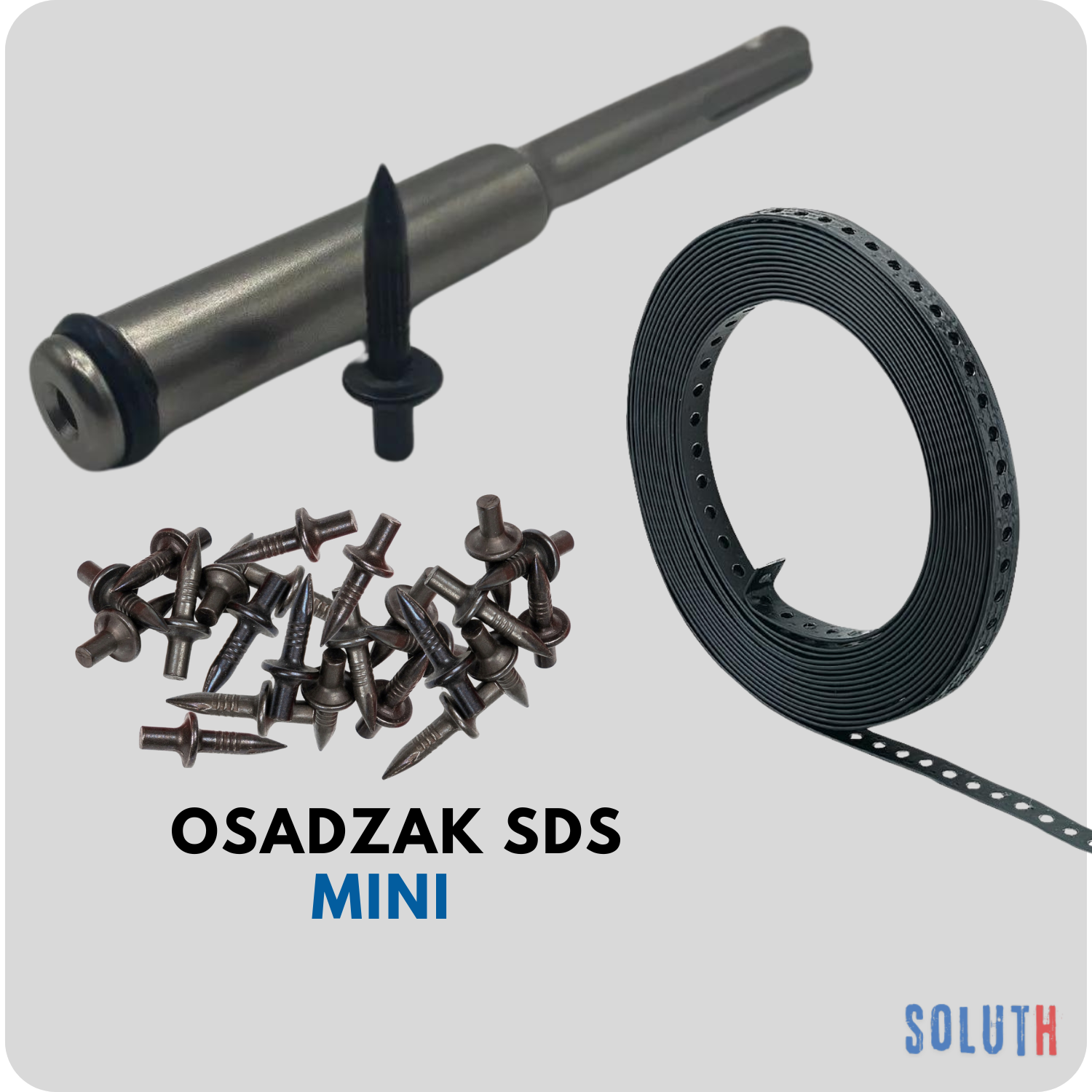 ➡️ Jeden osadzak SDS, jedna taśma perforowana i 200 sztuk gwoździ do osadzania w betonie